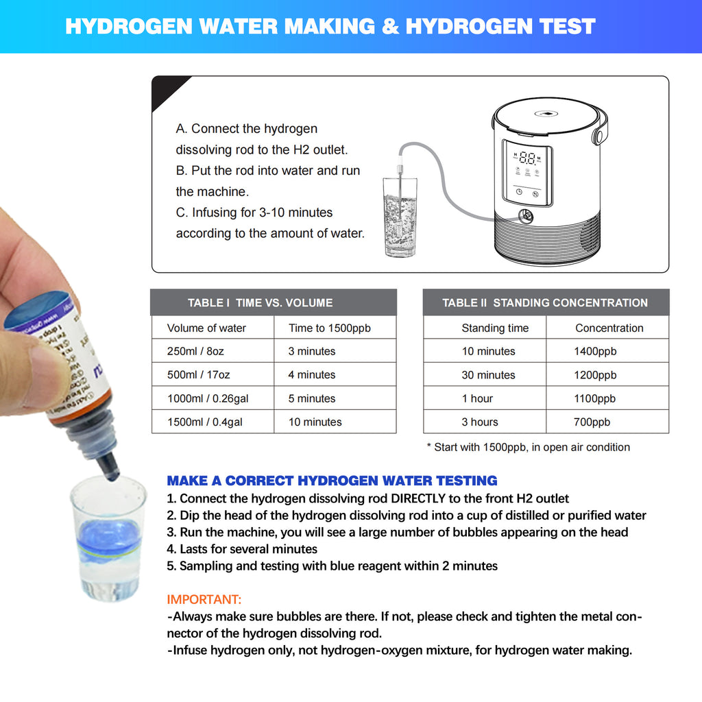- 3in1 multi-purpose. Included hydrogen infusing stick changes this machine to a universal hydrogen water generator up to 1600ppb for all kinds of water and drink. Complete full range of accessories include: silicone nasal tubes, full-face inhalation cup, hydrogen diffusing rod, hydrogen water spayer bottle, hydrogen test reagent kit, H2-O2 maxing adaptor.